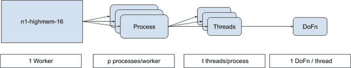 하나의 Beam Worker에서는 특정 DoFn을 실행하기 위해 여러 개의 Process가 생성될 수 있어요. 보통 Worker Process의 개수는 Worker의 vCPU 개수에 따라서 달라져요. 하나의 Process 안에서는 몇백 개의 Thread가 동시에 실행될 수 있어요. 이렇게 해서 Beam은 컴퓨팅 자원을 최대한 Utilize 시키게 된답니다.