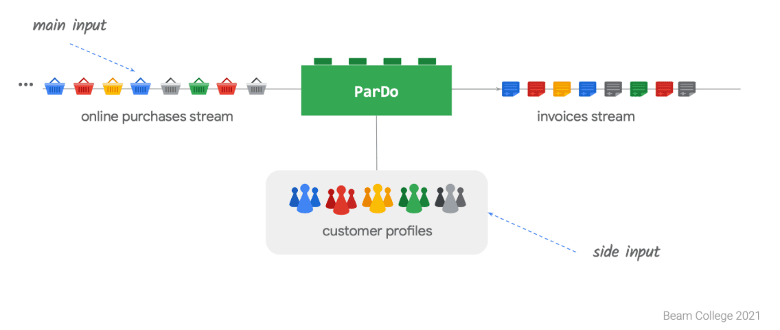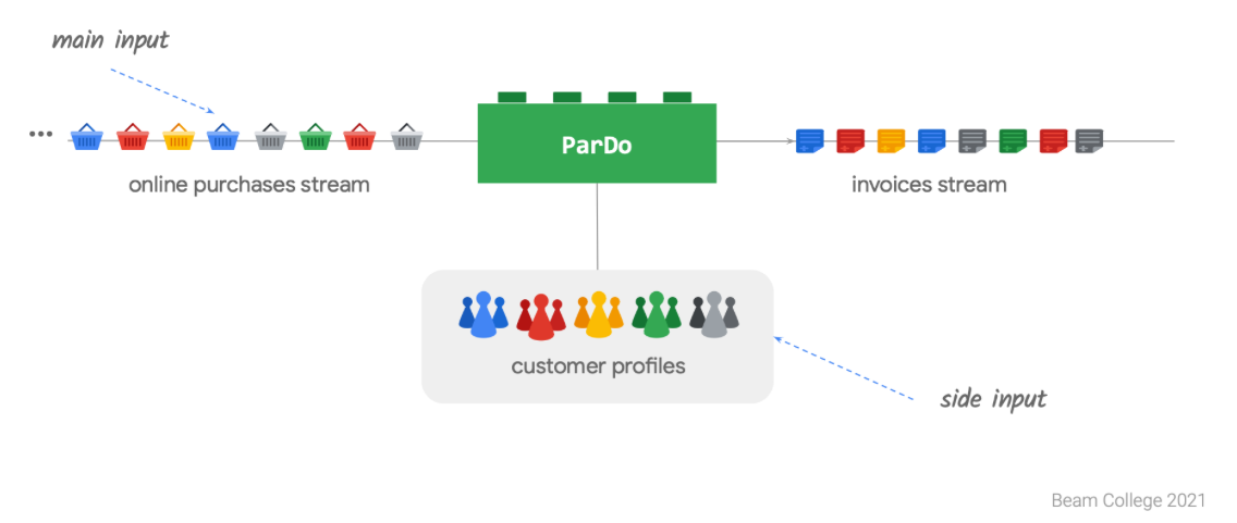 Side Input은 DoFn이 시작되기 전에 Side Input으로 들어오는 PCollection이 준비될 때 까지 기다린 뒤, 완료되었다면 PCollection을 앞선 Util Function들을 활용하여 실제 메모리에 데이터를 올리게 된답니다.