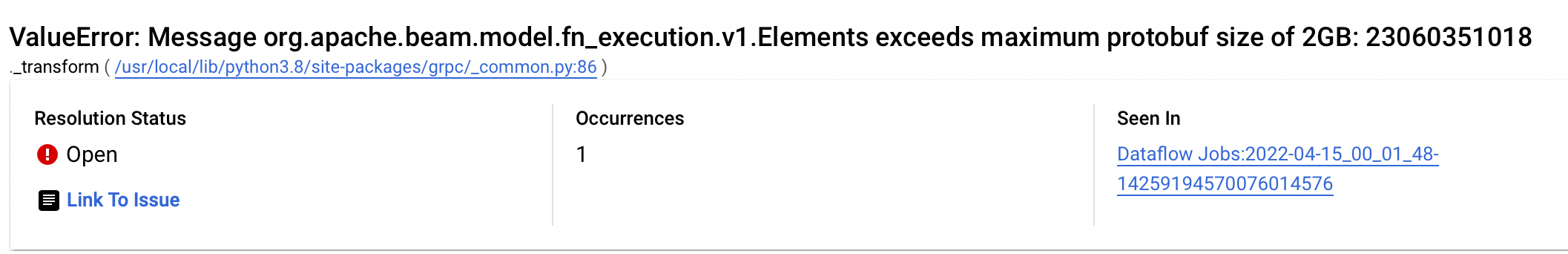사실 앞서 언급한 Indexing Pipeline을 구현하기 전에 한가지 크게 간과한 점이 있어요. 공개된 Beam의 코드를 보면 알 수 있듯, Beam은 Worker끼리 gRPC를 통해 데이터를 주고받아요. 즉, 하나의 PTransform 안에서 처리되는 모든 데이터는 protobuf의 형태로 serialization이 일어나요. 이때 생기는 한계점이 있는데, 바로 하나의 Element는 최대 2GB의 데이터만 품을 수 있다는 점이에요. Faiss Indexing을 활용하는 상황은 보통 임베딩 벡터의 크기가 대단히 크기 때문에 임베딩 벡터들을 전부 하나의 Element로 Aggregate하게 된다면 2GB를 넘는 경우가 대다수에요!