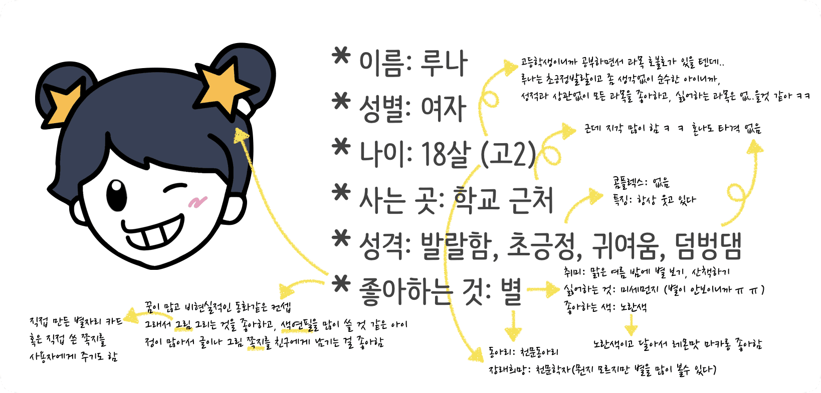 위와 같은 과정을 거쳐 아래와 같이 페르소나에 대한 구체적인 소개서(?)를 쓸 수 있게 되면 성공이에요! 페르소나 설명만 봐도 루나가 어떤 성격이고 뭘 좋아할 것 같은지 상상이 되죠?