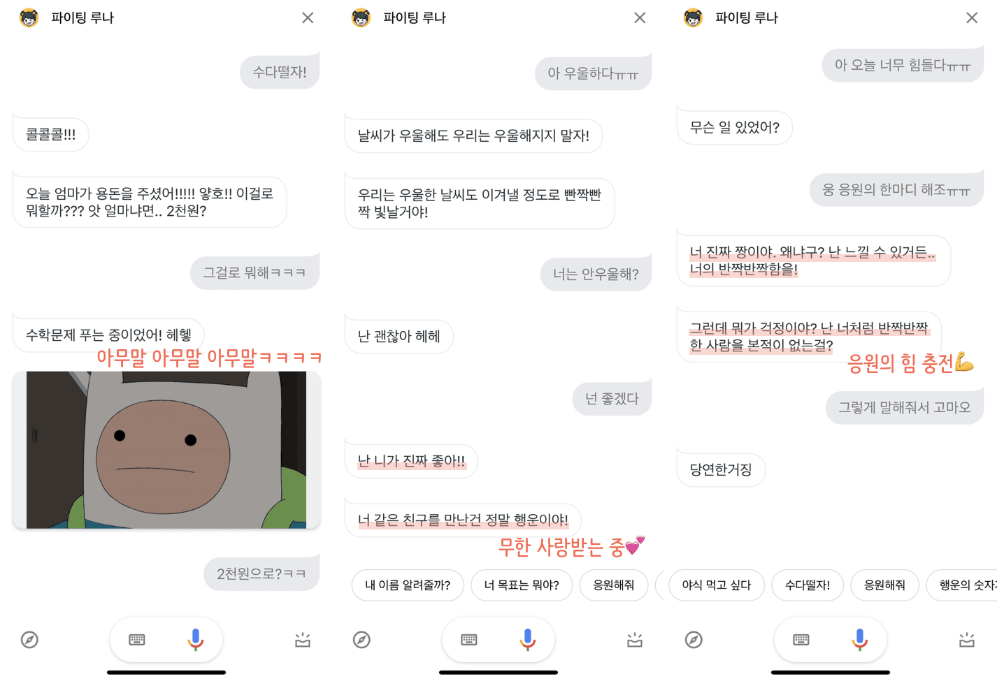 이렇게 루나는 사람들이 심심할 땐 아무말(ㅋㅋ)도 해주고, 같이 숫자맞히기 게임도 하고, 힘든 일이 있을 때 응원도 해주며 어설프지만 귀여운 친구가 되어주고 있어요.
