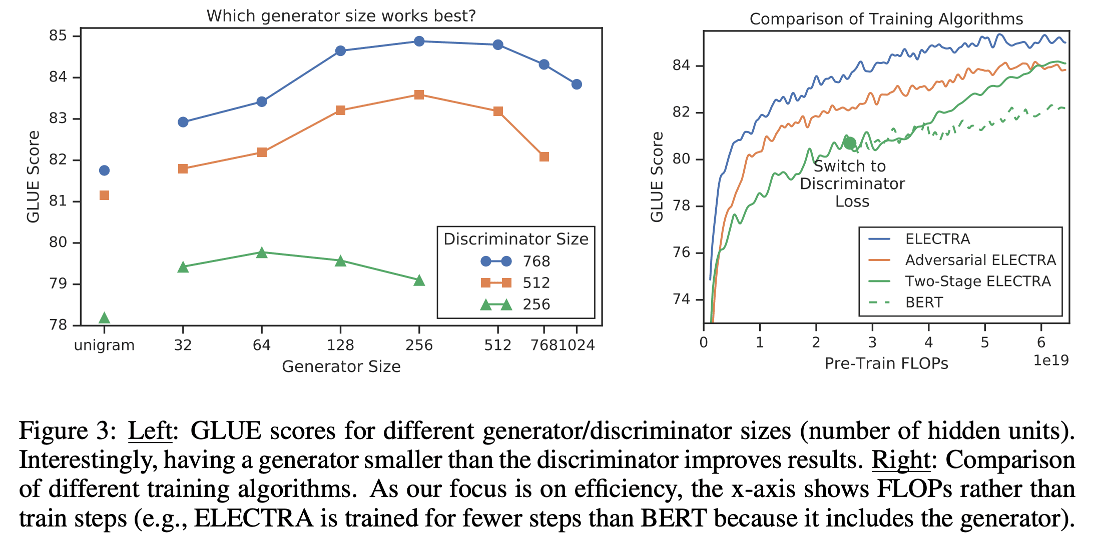 실험은 모두 동일하게 500K 스텝 동안 학습시켰으며 결과는 Figure 3의 왼쪽과 같습니다. 모두 동일한 스텝만큼을 학습했기 때문에 작은 모델은 똑같은 계산량, 시간만큼 학습하면 더 많은 스텝을 돌 것이고, 결과적으로 작은 모델 입장에서는 계산량 대비 성능을 손해본 셈입니다. 그럼에도 불구하고 discriminator의 크기 대비 1/4 - 1/2 크기의 generator를 사용했을 때 가장 좋은 성능을 보입니다. 이런 실험 결과를 논문은 다음과 같이 해석합니다.