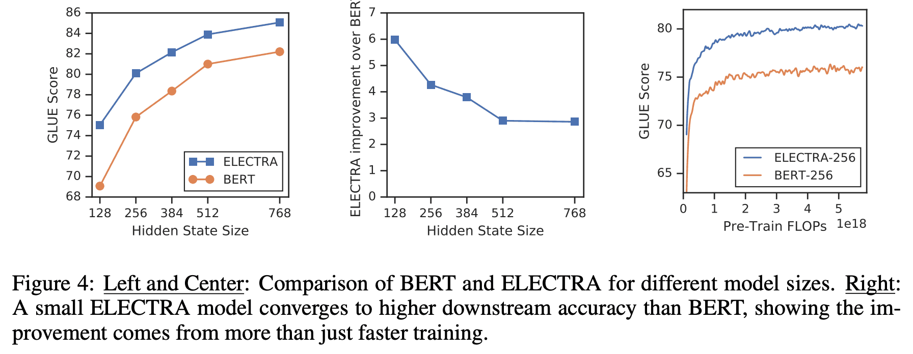 추가적으로 히든 레이어 크기에 따른 BERT와 ELECTRA의 성능 변화 실험도 있었는데요. Figure 4에서 볼 수 있듯이 히든 레이어의 크기가 작아질수록 BERT와 ELECTRA의 성능 차이는 커진다는 사실을 알 수 있으며, BERT에 비해 ELECTRA는 모델이 작아도 매우 빠르게 수렴함을 알 수 있습니다.