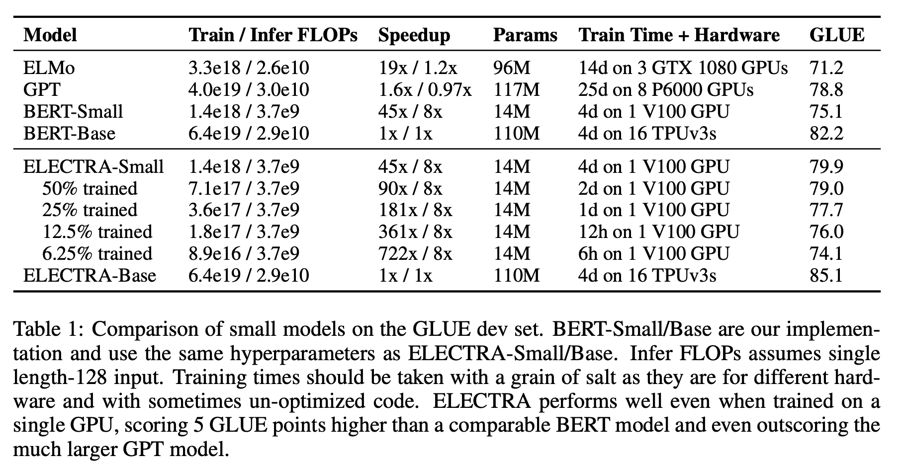 저자들이 제시한 연구의 큰 향상점 중 하나는 pre-training의 효율성 향상입니다. 이를 검증하기 위하여 저자들은 하나의 GPU로도 빠르게 학습할 수 있는 수준으로 작은 모델을 만들어보는 실험을 진행하였습니다.