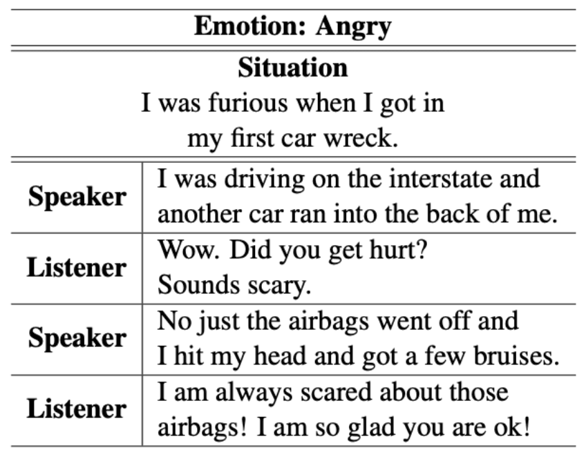 (배경) 위 예시처럼 사람은 상황과 상대방의 감정에 따라 적절하게 대답을 하게 됩니다. 상대방에게 '공감'하기 위해서는 감정적인 답변 자체를 만드는 능력도 필요하지만, 상대의 감정을 이해하고 그에 적절하게 대답하는 것이 더 중요한 포인트입니다. 하지만 이렇게 상대방의 감정에 공감하여 적절한 대답을 만들어내는 대화 에이전트를 학습시키는 것은 매우 어려운 일입니다.