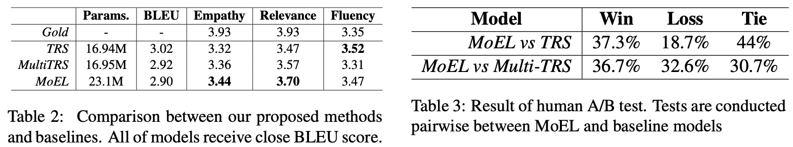 (결과) 성능 평가를 위해 competitive baseline들과 비교 테스트를 하였고, human evaluation도 하였습니다. SOTA를 찍었으며, 분석을 통해서 MoEL이 효과적으로 올바른 listener에 집중하고 있다는 걸 보였습니다. 또한 모델이 각 emotion에 어떻게 대응하는 게 알맞은 것인지 학습했습니다. 실험 결과를 통해 볼 때, 기존 연구에서 발전된 해석 가능한 생성 모델이라 생각합니다.