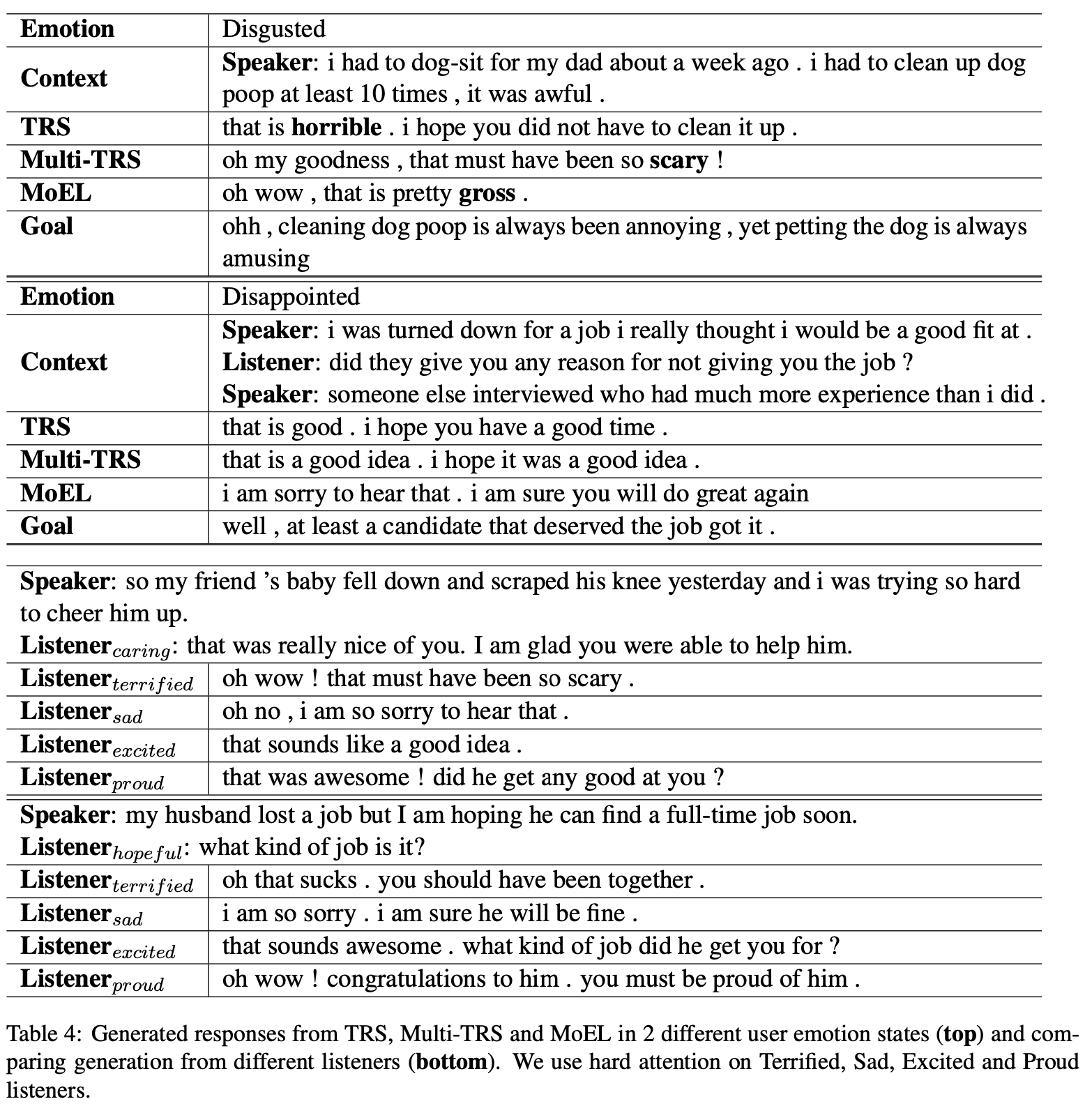 이 listeners는 Meta-listener와 함께 학습되게 하고, Meta-listener는 classification의 결과 분포를 기반으로 각 listener의 출력을 softly combine 합니다. 이를 통해서 모델이 감정 문맥에 대한 이해를 바탕으로 어떻게 적절한 리액션을 고를지 explicit하게 학습할 수 있습니다. (즉, 해석 가능한 결과를 내놓을 수 있습니다.)