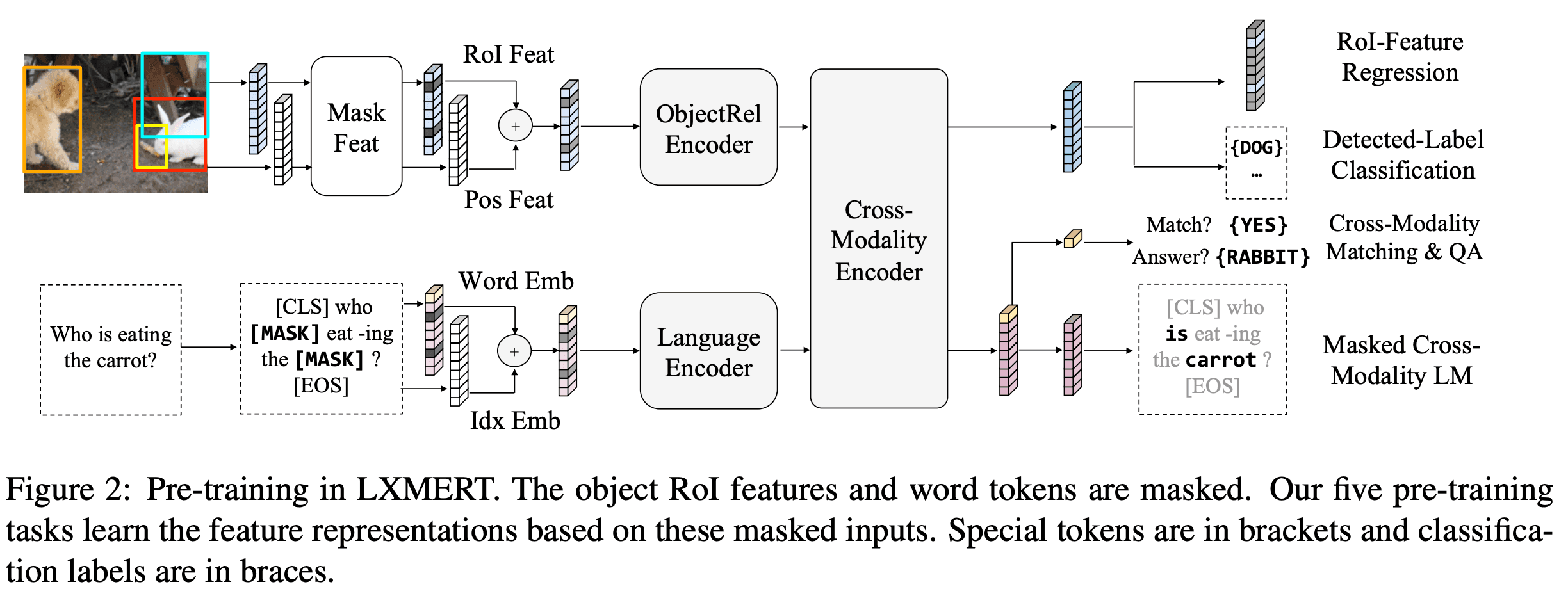 - masked object prediction via RoI-feature regression: Vision의 ROI feature를 masking하고 이 feature vector 자체를 맞추는 문제를 풀었습니다.