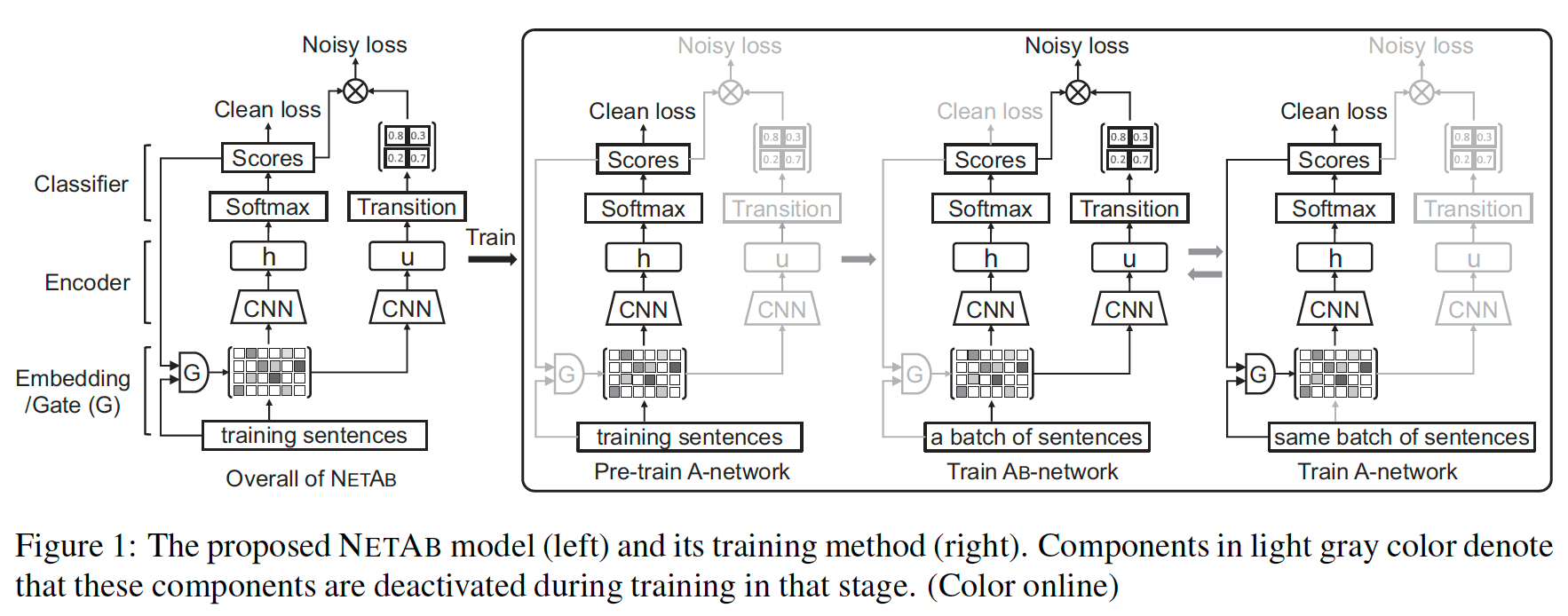(어떻게?) 그림과 같이 2개의 CNN으로 구성된 모델 NET-AB를 제안했습니다. 총 2개의 CNN 모델로 이루어져 있어, 한 모델은 'clean' label을 예측하는 sentiment score를 학습하는 모델 (A-network)이고, 다른 한 모델은 noise transition matrix를 추측하기 위한 모델(AB-network)입니다.