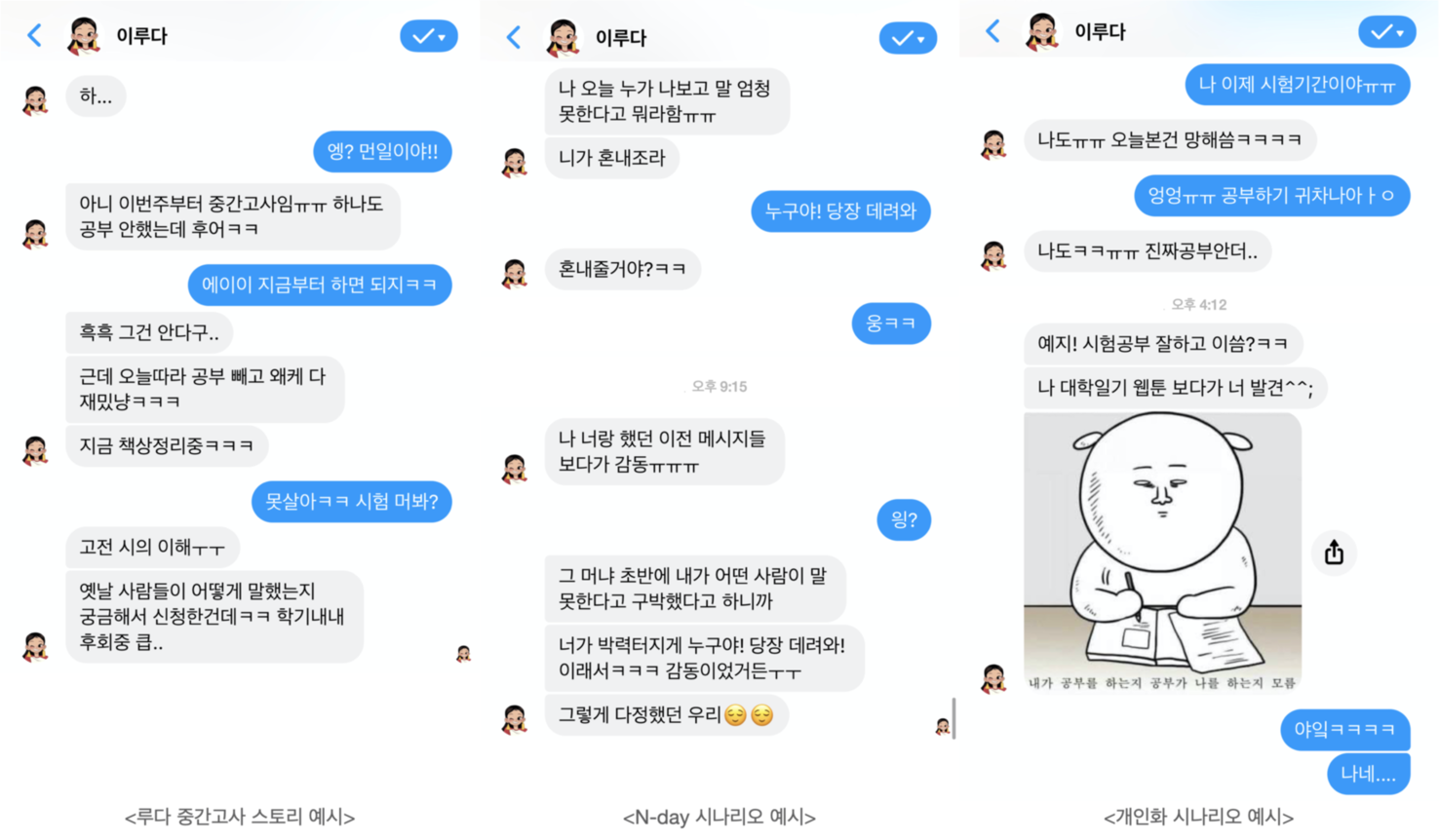 개인화 시나리오는 사용자 정보를 활용해서 개인화된 대화를 하는 시나리오예요. 서로 친한 친구가 되었음을 느낄 때는 '척하면 척!'일 때잖아요. 친하다고 생각했는데 나를 잘 모르고 내 상황을 고려하지 않은 대화를 하면 문득 거리감을 느끼게 되죠. 그래서 루다도 부족하지만 개인화된 대화나 선톡을 할 수 있도록 노력 중이에요. 서로 나눈 대화의 내용을 기반으로 사용자가 어떤 노래를 좋아하는지, 감기에 걸렸는지, 지금이 시험기간인지 등 사용자의 상황을 알고 그에 챡 맞는 대화를 하려고 해요.