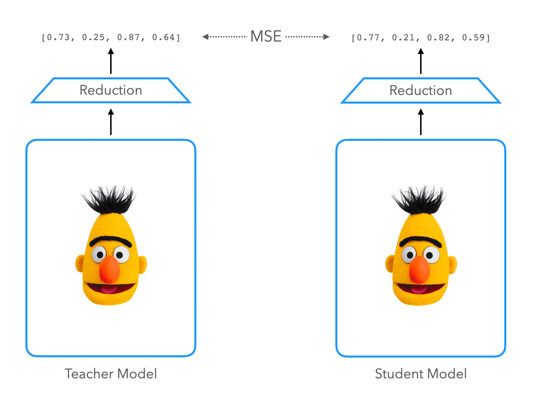 Metric Learning을 수행하는 경우 결국 인코더에서 생성해내는 임베딩의 성능이 전체 모델의 성능을 좌우한다는 점에 착안하여 고안한 방법입니다. 와 가 같은 문장에 대해 각각 Student와 Teacher의 인코더에서 만들어 낸 임베딩이고, 와 의 차원을 갖는다고 할 때, Objective는 아래처럼 정의합니다.