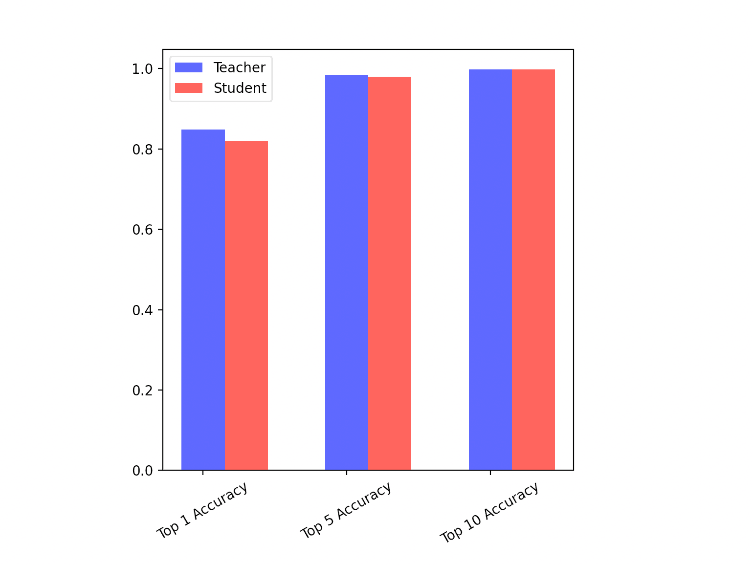이 경우 3배에 가깝게 속도가 향상되면서, Top 1 정확도는 Teacher 모델의 96.2%, Top 5 정확도는 99.3%, Top 10 정확도는 99.9%를 유지하였습니다.