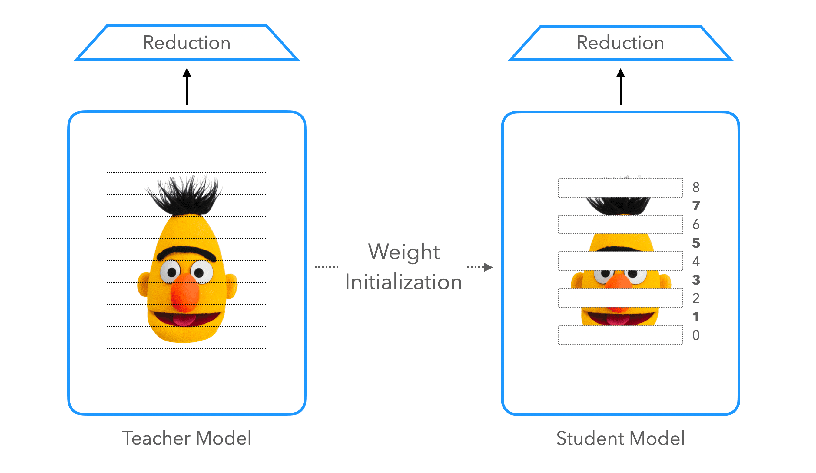 첫 번째 방식으로는 트랜스포머 레이어의 크기를 줄일 수 없습니다. 다만 Teacher 모델의 트랜스포머 레이어를 일정 부분 취하여 모델을 구성함으로써 상대적으로 적은 실험을 통해 예측 가능한 속도와 성능을 안정적으로 뽑아낸다는 것이 장점입니다. 예를 들어 8 레이어를 사용하는 Student를 만들기로 결정하였다면 24 레이어의 Teacher에 대비하여 약 3배에 가까운 추론 속도 향상을 불러옵니다.